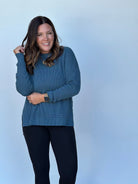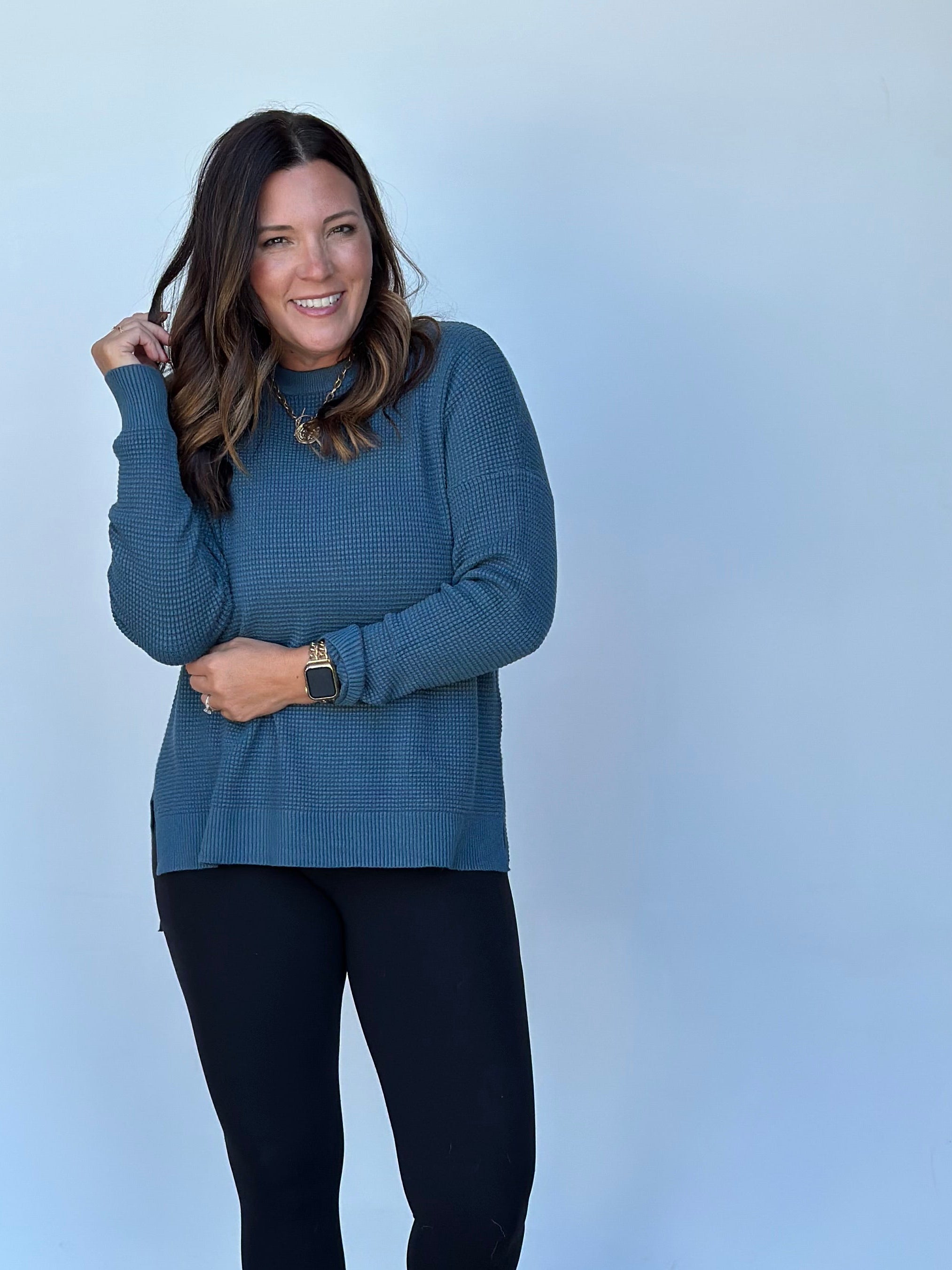 This long-sleeve waffle-knit sweater in a gorgeous blue fall shade is a perfect addition to any autumn wardrobe. Its medium weight makes it versatile for layering or wearing on its own, providing just the right amount of warmth for cooler days. The waffle-knit texture adds a touch of coziness and visual interest, while the rich blue color is both striking and seasonally appropriate. Whether paired with leggings for a laid-back look or with jeans for a more polished vibe, this sweater effortlessly combines comfort and style for fall.